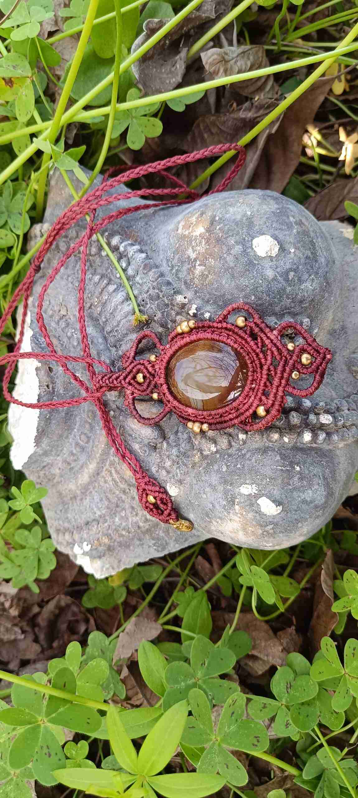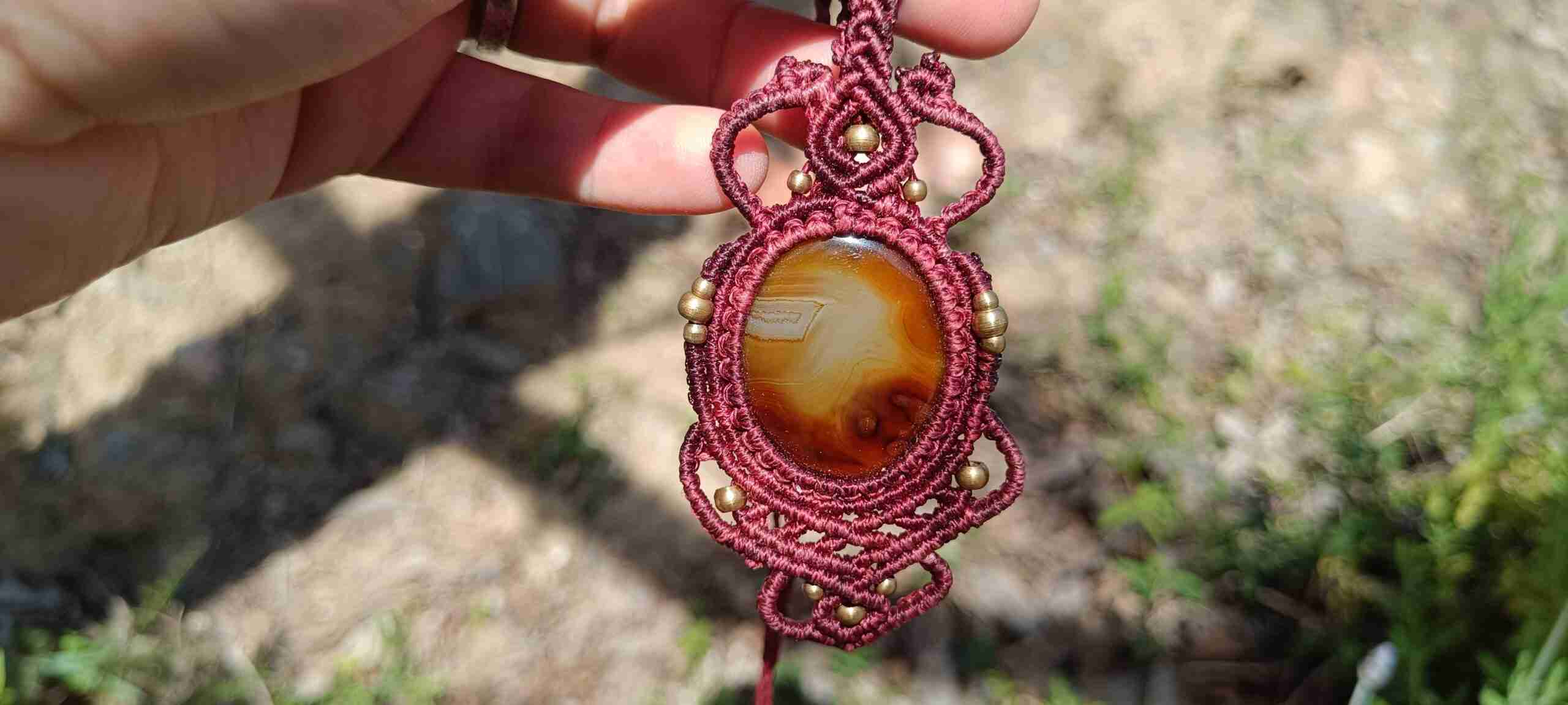 Sumérgete en el misterio y la dualidad con el colgante de macramé Perséfone, una joya que evoca la esencia de la diosa griega Perséfone y las propiedades mágicas del ágata marrón bandeada.