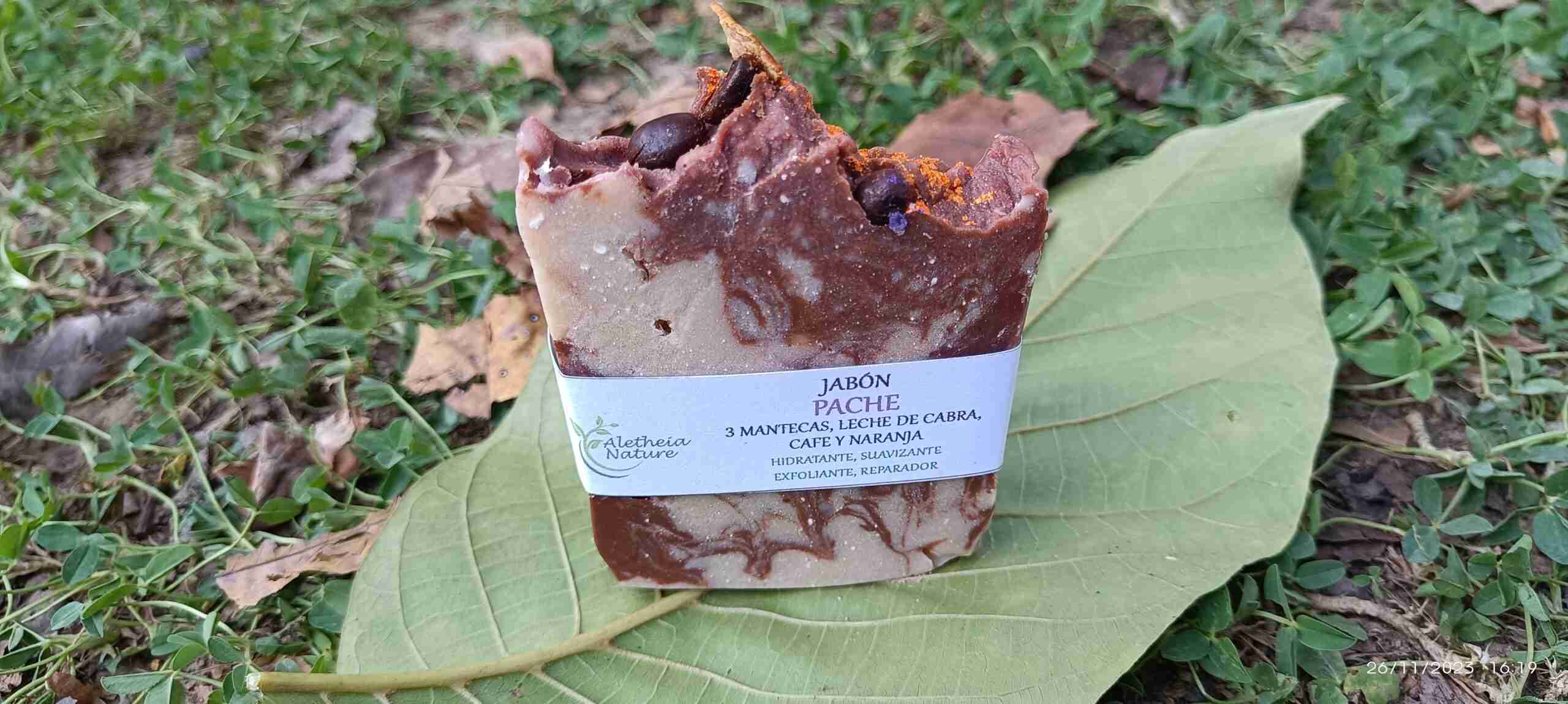 Jabón de Café y Naranjas con Manteca de Cacao, Karité, Mango, Aceite de Almendras, Leche de Cabra, Café en Polvo, Aceite Esencial de Naranjas, Aceite Aromático de Café y Corteza de Naranjas Dulces, en Honor a Pache**
