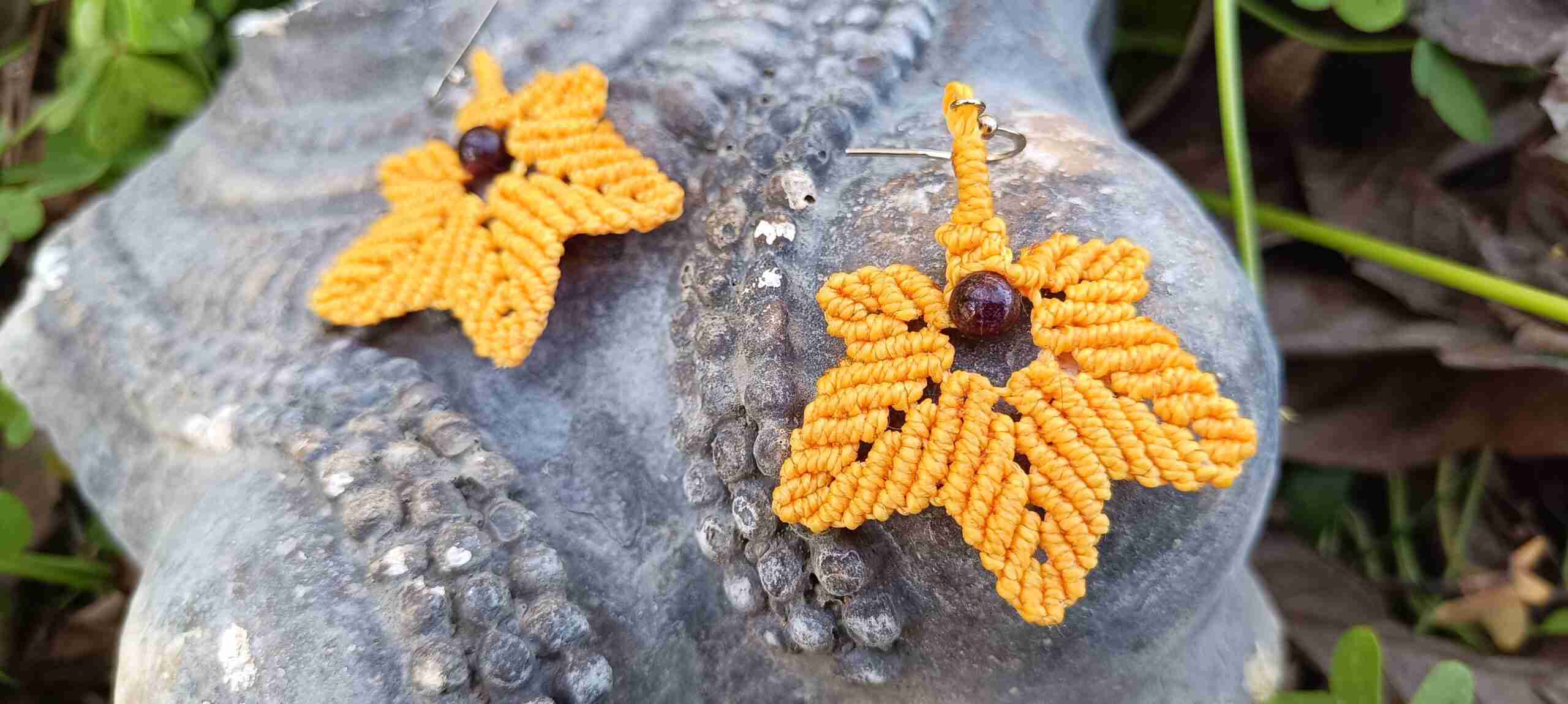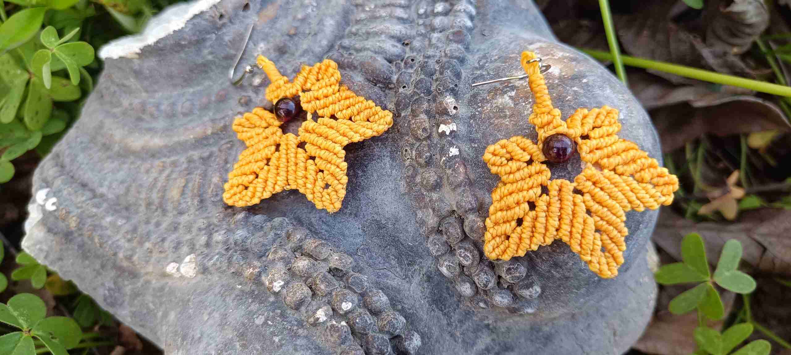 Sumérgete en la belleza natural y la magia de la tierra con los pendientes de macramé «Arce», una creación inspirada en la forma de la hoja del arce amarilla y adornada con una cuenta de rubí con zoisita. Estos pendientes son mucho más que una joya; son una conexión con la diosa Arce y las propiedades mágicas del rubí con zoisita.