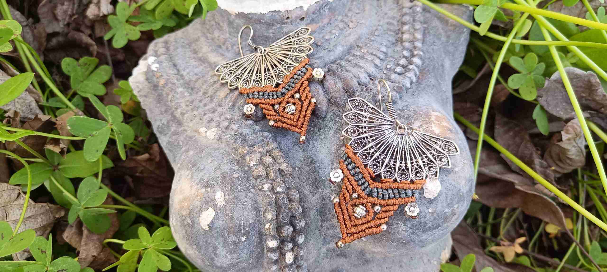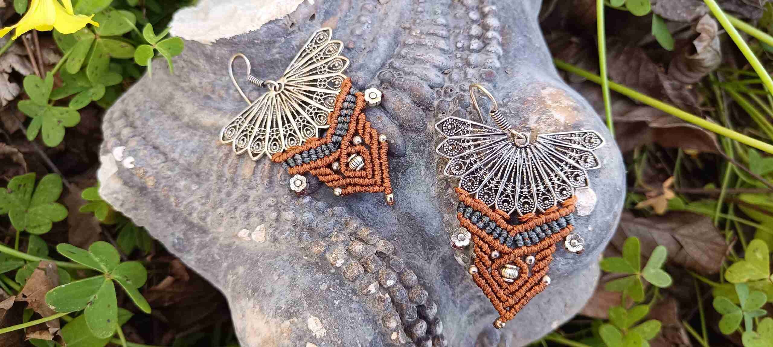El trenzado en macramé de color ocre agrega un toque cálido y terroso a los pendientes, resaltando cuentas plateadas y motivos en gris que añaden un brillo sutil y un detalle encantador. Cada detalle de estos pendientes está cuidadosamente elaborado para capturar la esencia de la madre de los vientos y transmitir su fuerza y serenidad.