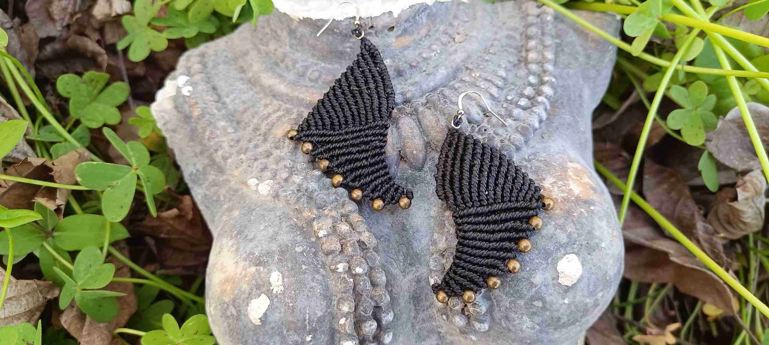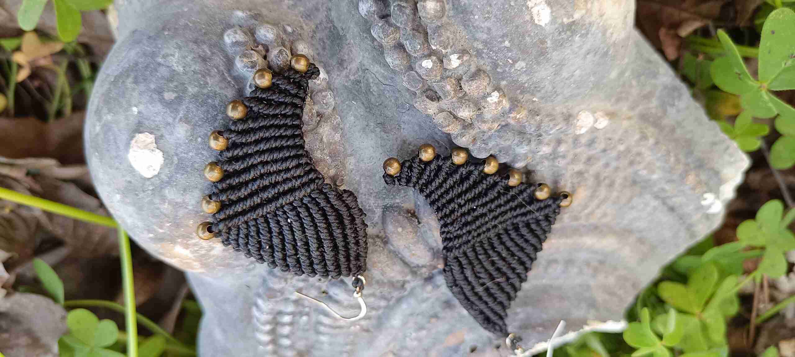 Sumérgete en la elegancia y la fuerza del mar con los pendientes de macramé «Nereo», una obra artesanal de color negro que evoca las olas del océano y está adornada con cuentas de bronce, capturando la esencia del dios griego Nereo y las propiedades mágicas del bronce.