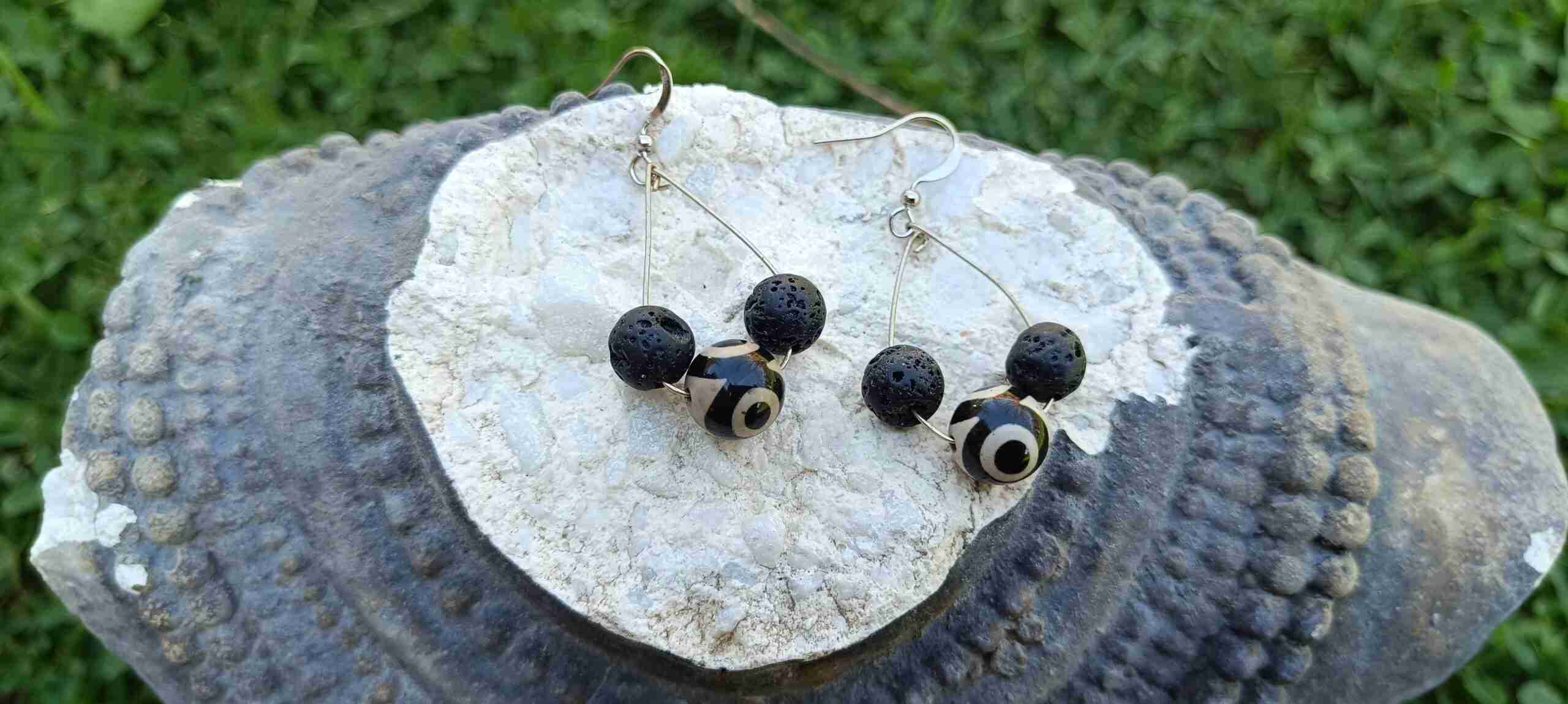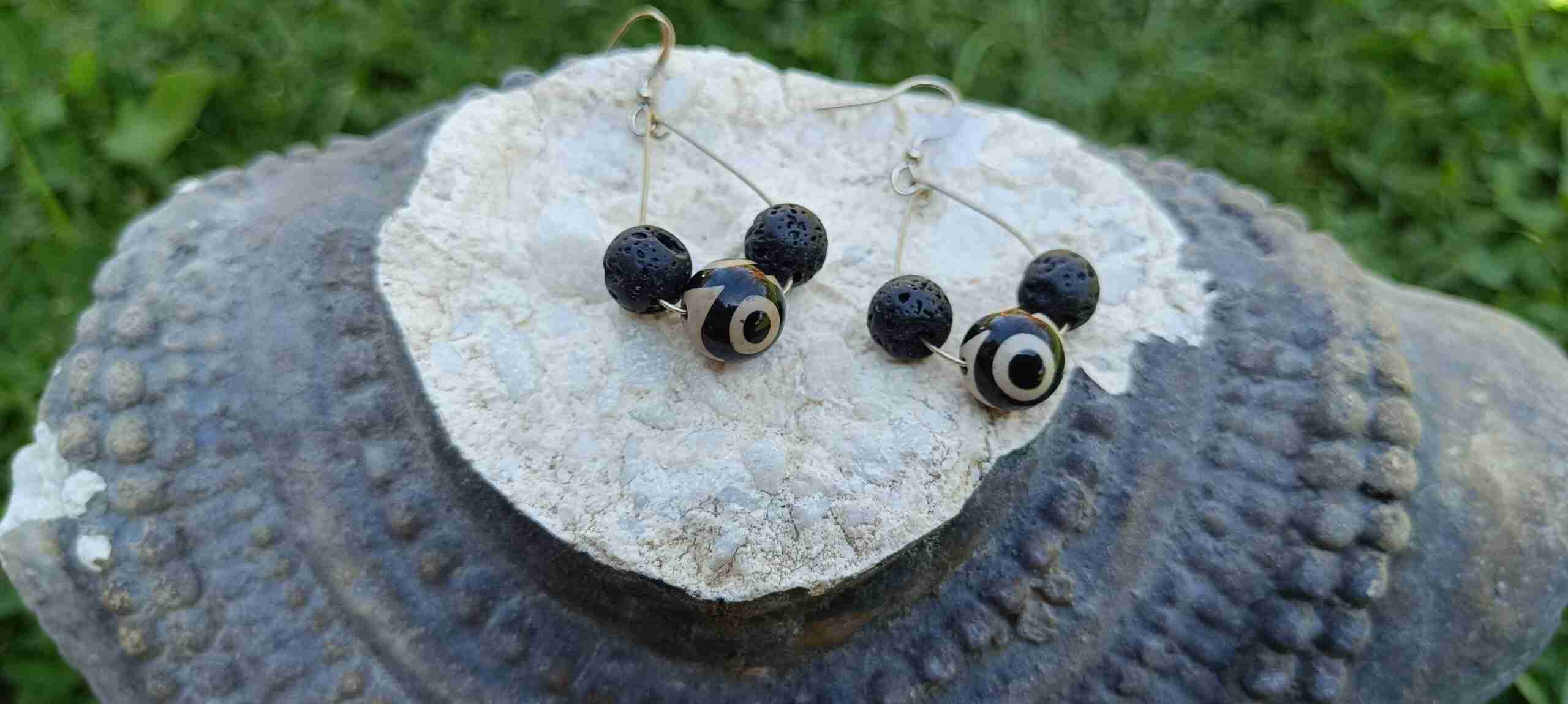 Los pendientes de alpaca «Tibet» son una joya excepcional que fusiona la elegancia de su forma de lágrima con las poderosas propiedades de las piedras naturales. Estos pendientes están adornados con dos cuentas de piedra lava y una de ágata Tibetana negra y blanca, lo que les otorga un significado especial en términos de propiedades mágicas y energéticas.